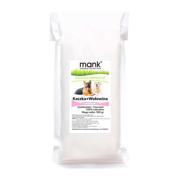mank® KACZKA+WOŁOWINA – mięso z kaczki uchodzi za najszlachetniejszy rodzaj drobiu, jest bardzo kaloryczne,  w połączeniu z wołowiną uzyskujemy pyszną, zdrową i energetyczną karmę dla Twojego psa, w której oprócz drobno zmielonych kości, chrząstek i mięsa z kaczki znajdują się większe kawałki mięsa i serc wołowych oraz podrobów.